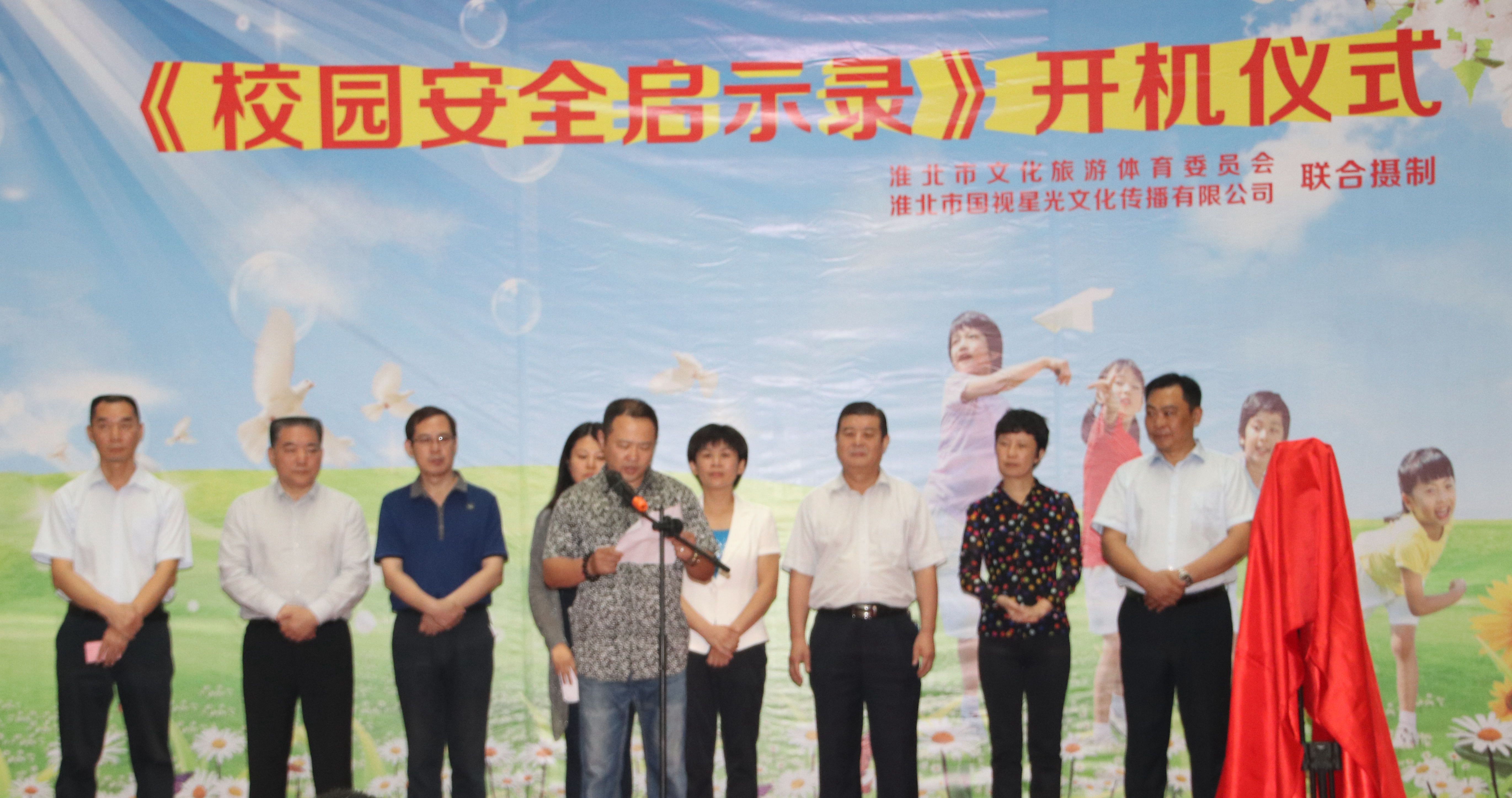 仪式最后,淮北市委常委、宣传部长顾文、教育局长陈新华、市文化旅游体育委员会主任李强、导演郝晶共同为科教电影《校园安全启示录》开机揭幕。