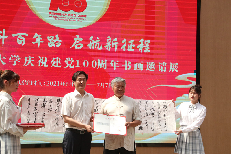 张乃田教授代表参展人员发言:再过几天,我们即将迎来建党100周年这一伟大的历史时刻,为了庆祝这一天的到来,我和我的同仁们,用我们手中笔,歌颂先辈们浴血奋斗的革命历程,讴歌新时代,畅享新旋律,为实现中华民族伟大复兴贡献一份力量,表示了永远跟党走的决心。