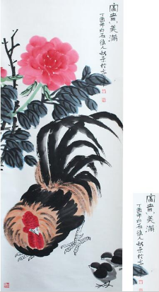 此《富贵美满》图中的牡丹颇具齐白石笔下牡丹之风范,其牡丹花朵硕大,运用了夸张的手法,粗笔写意,以没骨法写成体现出了白石老人的“似与不似之间”的艺术主张。画者用羊毫软笔偏锋画花瓣,表现出每一片花瓣薄薄而柔软的感觉。叶片用石青石绿染成,有浓有淡,能分出阴阳向背。再用湿墨勾画出叶筋,生动有致。牡丹花下绘有一只母鸡引领着两只幼雏,在地上漫步啄食。小鸡显得稚嫩怯弱,母鸡羽毛蓬松亮丽,尾羽翘立,威武雄壮。子母鸡除寓含五子登科之意,还表现出母鸡带着雏鸡四处觅食、其乐融融的田园生活,极具生活意趣,值得收藏。