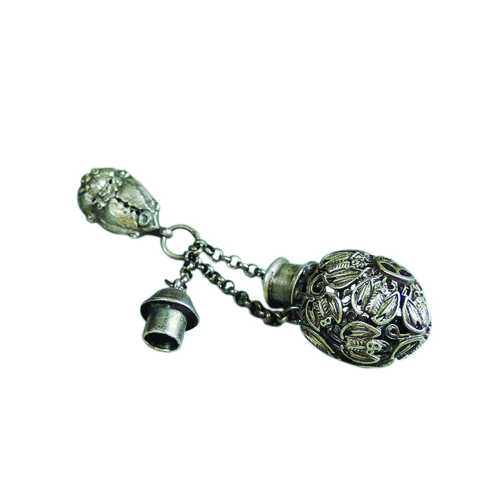 这只清末“福在眼前”镂空香囊(见图),呈椭圆形,为纯银打造,最宽处直径约2.5、高约5厘米,重13克。香囊周身镂空透雕作八只蝙蝠围于两枚钱币周边,寓意福在眼前。蝙蝠和钱币的空隙处,还雕刻出了云朵纹,方寸之间,繁杂而不凌乱,更显工艺精湛。香囊中间为空心,以放置香料,方便随身携带。香囊的盖子上端置挂钩,以银链相连。为使挂钩好看,更具装饰性,匠人独具匠心,在钩的正面焊接了一块银片,并在上面镂雕了蝙蝠展翅的精美图案,活灵活现,栩栩如生,加上金水足,既美观又吉利。银片的背面还雕刻了“庆源纯银”四个工整的小字。整个香囊造型精美,小巧别致,寓意吉祥,为文人雅士的把玩佳品。