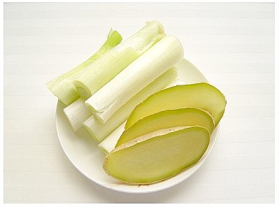 5.大葱切长段,生姜切大片。