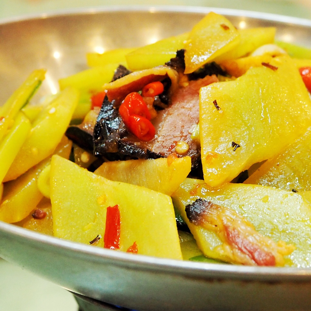 铁板香汁日本豆腐。好久没吃日本豆腐了,忍不住来了一发。跟家常的甜口做法不同,这道更偏向咸辣。搭配日本豆腐的,除了常见的鸡蛋,还有火腿和肉丝。味道层次一下子就丰富了,肉香十足。很喜欢吃盘底焦香的鸡蛋层,香脆入味。日本豆腐吃的就是软嫩多汁的口感,有香甜味就可以啦~火腿和肉丝的量不多,主要还是在调和味道。看起来颜色不深的豆腐菜,吃起来还是够辛辣,隐约能吃到辣椒片。整道菜就是入口香甜,回味辛咸。