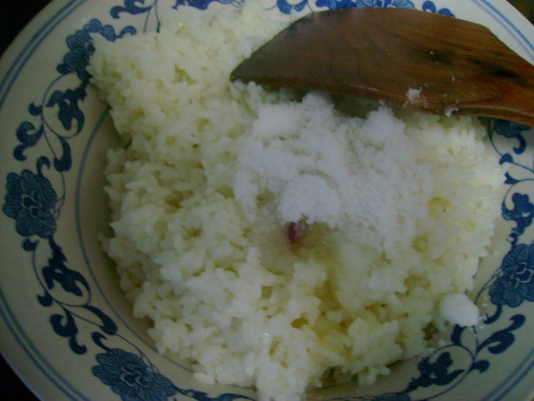 6.白米饭加盐、白糖、醋、香油拌匀放到不烫。