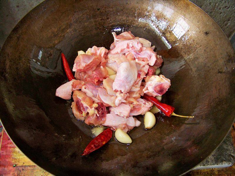 1.鸡肉斩大块,流水冲尽血水,大蒜去皮成整蒜子,生姜切片待用。
