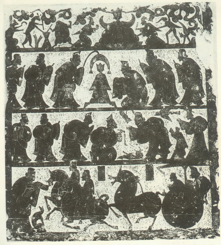 就其内容来说,主要是起到赞颂和教化的作用,比如有些胡汉战争图,是为歌颂汉朝的将士抵御外侵,战胜匈奴的刻画;教育借鉴的题材,则是以画的形式对人们进行道德、思想教育,包涵了丰富而深刻的思想文化。它们的出现,既与文化相关,又和经济有着密切的联系。比如山东是儒家的发祥地,注重儒学教育,因此出土的历史故事题材相对较多。不同墓主的文化修养、地位等方面的原因,也会刻画符合身份或者喜好的题材。西汉晚期到东汉早期,“历史故事画渐多,而且集中在画像石祠堂中。孔子见老子、周公辅成王、胡汉战争、泗水升鼎等是祠堂类画像中最为常见和程式化的几种历史故事,孝子烈女义士刺客故事还很少见。”[1]