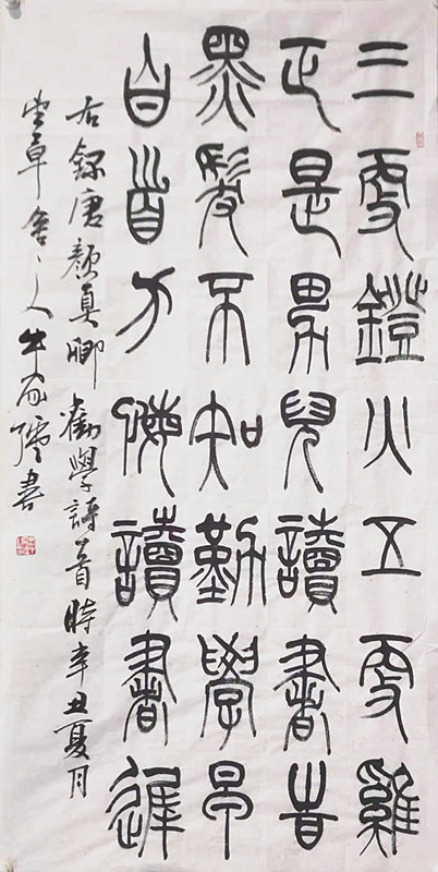 牛家强教授经常为学生和诸友手篆此诗,和他的职业、书学境界有很大的关系。牛家强勤奋好学、悉综古调、宽厚仁慈,希冀受书者能从本诗中晓喻勤学苦读才能使人走向成功的真谛。