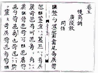 《白石道人歌曲》:词曲专集。宋代姜夔撰。内有琴歌《古怨》一首,旁缀减字谱,为现存最早的减字谱琴谱。