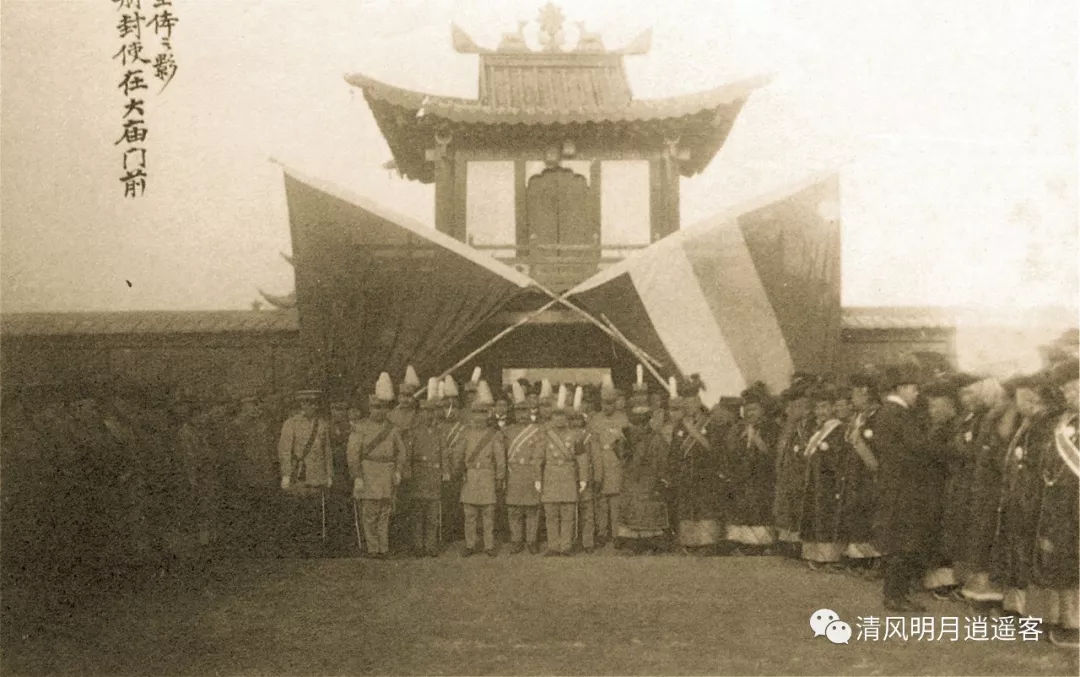 1920年1月1日,外蒙活佛册封专使徐树铮(前排中立臂带黑圈者)为哲布尊丹巴八世举行册封典礼。图为徐树铮与其随员以及外蒙上层人士在库伦大前合影。