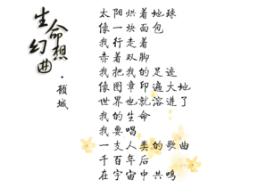 顾城谈到他创作这首诗时的心境:“我似乎真的进入了光的世界——太阳在高空轰响着,把白热的阳光,直泻在广阔的河滩上,直泻在河滩上千百个圆形的小湖里,直泻在我脱皮的手和红肿的肩下……我好象被熔化了!皮肤再不是我的边界,大地再不能用引力把我捕获……我是那么那么地自由,随着滚热的气流在太空中浮动。”就是在这种“神与物游”“物我合一”的心境中,一连串美妙的诗句从心中流出:“让阳光的瀑布,/洗黑我的皮肤”, “我抛下了/新月——黄金的锚”,“用金黄的麦秸,/织成摇篮,/把我的灵感和心/放在里边”,“我把希望溶进了/我的生命”。这些诗句用隐喻、通感、意象叠加,造成奇特的美感效果。“诗以奇趣为宗,反常合道为趣”(苏轼论诗)词语的反常搭配,表现出知觉之间的转换,表现出孩童眼睛里晶莹、透明、梦幻、神秘的童话世界,表现出诗人对诗美和生活美的追求。